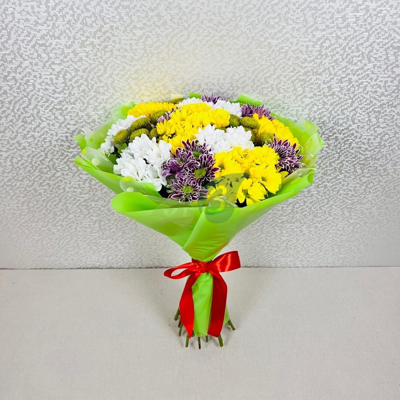 Великолепный букет из 19 веточек кустовой хризантемы. Букет составлен из хризантем разных цветов: сиреневых, зеленых, красных, белых и желтых. Эта красочная, радужная композиция принесёт в ваш дом праздник даже в обычный будний день.