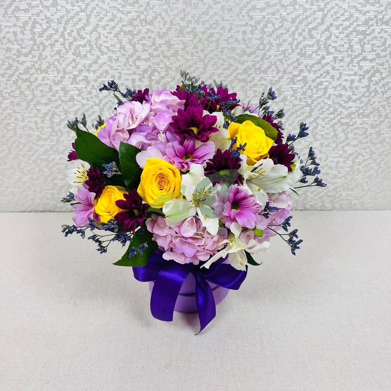 “Вивальди” – наполненная нежностью композиция из цветов всех оттенков фиолетового цвета. Для ее создания использовались прекрасные хризантемы, роскошные бутоны роз, утонченная астра, фитоспорум, альстромерия.
