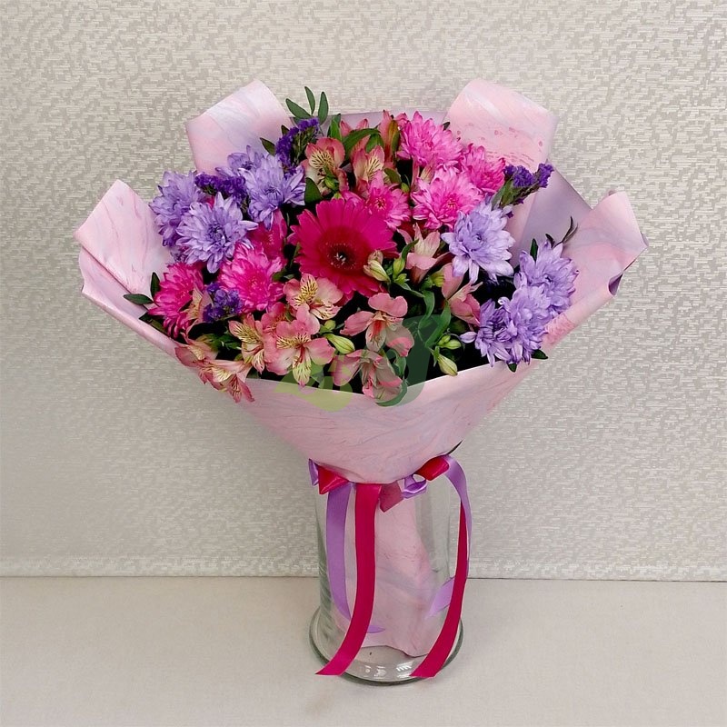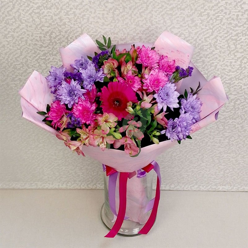 Идеальный букет цветов с доставкой – из микса хризантем и розовых альстромерий в композиции “Яркое сияние”. Сочетание сиреневого и розового цветов с малиновой герберой делают его ярким и нетривиальным.